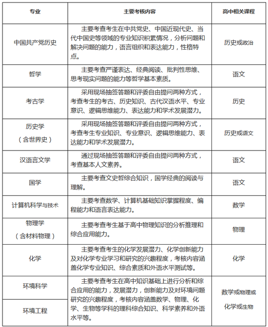 重点考查学科素养和学习发展潜能。人文科学试验班各招生专业考试内容为文史哲等招生专业相关学科素养;理科试验班(信息与数学)考试内容为计算机科学与技术专业相关学科素养;理科试验班(物理、化学与心理学)、理科试验班(环境理工、环境经管)考试内容为物理、化学等招生专业相关学科素养。均不限于中学教学大纲。