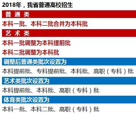 今年,我省高考本科录取批次将进行进一步调整。普通高校招生普通类本科一批、本科二批合并为本科批;艺术类本科一批调整为本科提前批,本科二批调整为本科批。