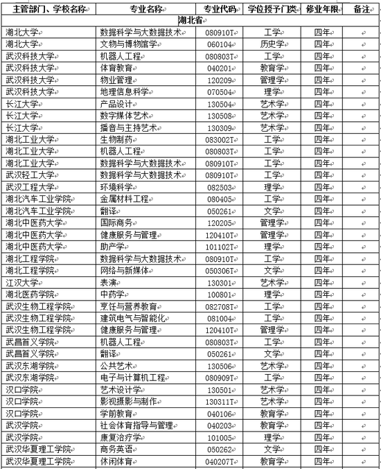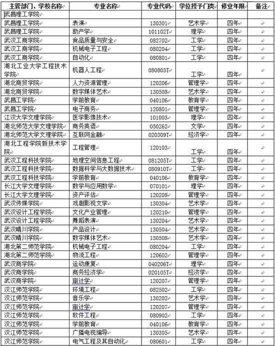 教育部近日公布2017年度普通高等学校本科专业备案和审批结果,根据结果,湖北省高校2018年新增备案本科专业名单如下: