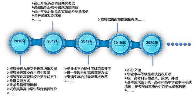 高考改革将分年逐步实施。2016年推进九年义务教育均衡发展、高校自主招生改革、深化高职院校分类考试招生,改进录取方式,改革监督管理机制等,并选择部分区县试点实施高中学生综合素质评价实施办法;2017年实施英语科目一年两次考试,逐步合并录取批次,并从2017年高一年级开始全面实施高考综合改革;2018年将首次组织高中学业水平合格性考试,并继续实施合并录取批次改革;2020年录取不分文理科,首次组织高中学业水平等级性考试,基本形成基于统一高考和高中学业水平考试成绩,参考综合素质评价的多元录取机制。