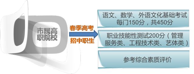 中职学校毕业生通过春季高考报考高职院校,参加文化基础与职业技能相结合的测试,其中文化基础考试科目为语文、数学、外语;职业技能考试分为工程技术类、管理服务类和艺术体育类;全市统一命题、统一组织,学生可自主选报1个考试类别。语文、数学、外语每门满分150分,职业技能性测试满分200分,总分650分。探索春季高考英语科目考试成绩由全国英语等级考试(PETS)成绩认定的办法。