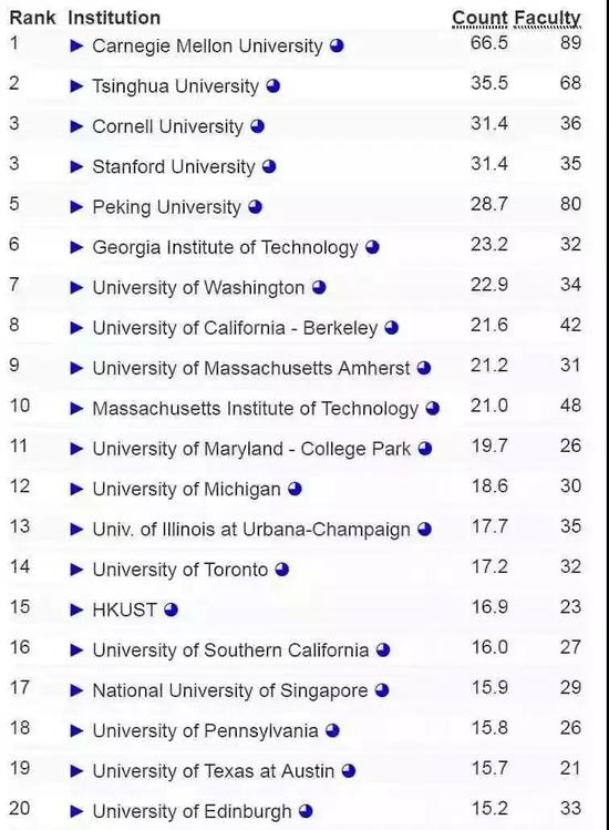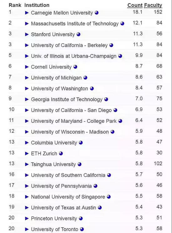 如果只考虑 AI 部分的排名,排名第一的是卡内基梅隆大学(CMU),清华大学排名第二,康奈尔大学和斯坦福大学并列第3;第5到第10名分别为:北京大学、 佐治亚理工学院、华盛顿大学、加州大学伯克利分校、马萨诸塞大学安姆斯特分校、麻省理工学院