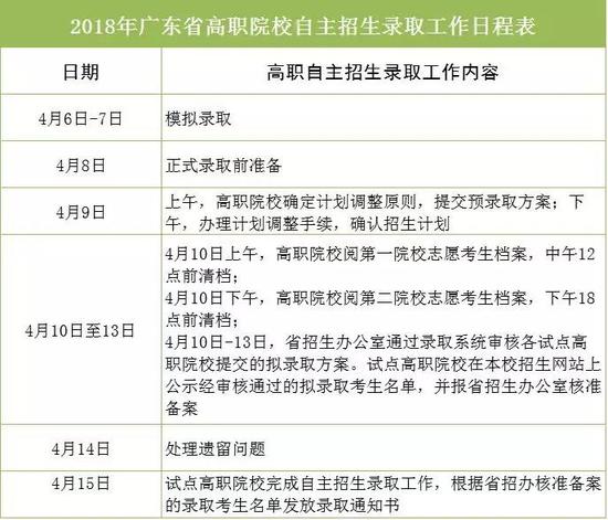 模拟录取时间为4月6日-8日,录取时间为4月9日-13日。具体按《广东省2018年高职院校自主招生录取工作日程表》执行。