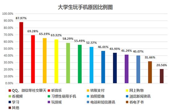 像王安锡一样利用手机进行社交聊天的大学生不在少数。根据中国青年网记者调查,有87.97%的大学生选择用手机进行社交聊天;其次是“听音乐”和“转账支付”,各占69.28%、65.19%,还有55.49%的大学生选择“习惯性使用手机”。