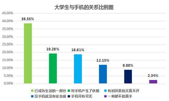 如果手机没有网络,会影响到你的学习和生活吗?调查显示,有38.55%的大学生认为“手机已成为生活的一部分”;其次是“对手机产生了依赖性”和“有时厌恶但又离不开”,分别占19.28%、18.81%;其余为“没手机就没有安全感”“一刻都不能离手”等。