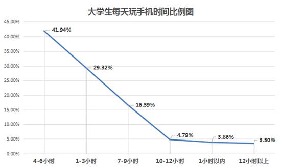 大学生每天花费在手机上的时间是多少呢?根据调查显示,使用手机4-6小时及以上的大学生占41.94%,其次为1-3小时和7-9小时,分别占占29.32%、16.59%。此外,小于1小时的占3.86%,还有3.5%的学生选择使用手机12小时以上。