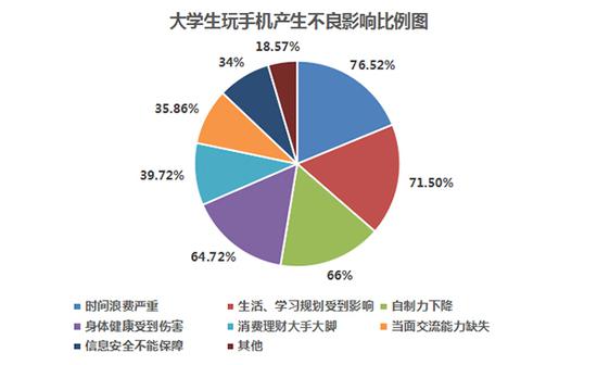 那么,长时间玩手机给自己带来哪些不良影响呢?数据显示,76.52%的大学生认为玩手机“时间浪费严重”,其次“生活、学习规划受到影响”和“自制力下降”,分别占71.5%和66%,还有64.72%的大学生觉得自己“身体健康受到了伤害”,同时还有39.72%的大学生认为自己“消费理财大手大脚”。