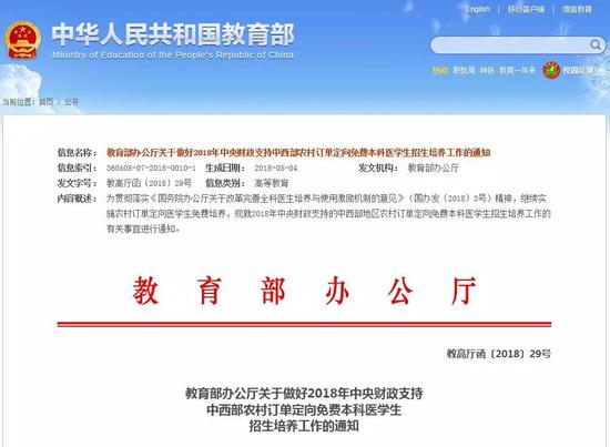 近日,教育部办公厅发布了《关于做好2018年中央财政支持中西部农村订单定向免费本科医学生招生培养工作的通知》(以下简称《通知》),《通知》指出,2018年继续实施农村订单定向医学生免费培养,有关事宜如下: