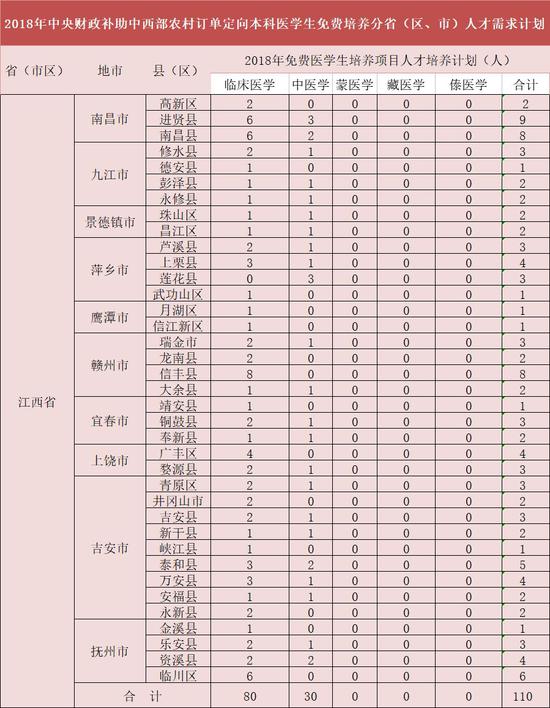 2018年中央财政支持高等医学院校为中西部乡镇卫生院培养订单定向免费五年制本科医学生共计6483人,其中江西110人(抚州14人)。专业包括临床医学、中医学、蒙医学、藏医学和傣医学。请有关省级教育行政部门将本科免费医学生订单定向招生计划纳入2018年度普通高等学校年度招生规模,在不增加承担免费医学生培养任务高校(以下简称培养高校)相应专业招生规模的基础上调整招生结构。