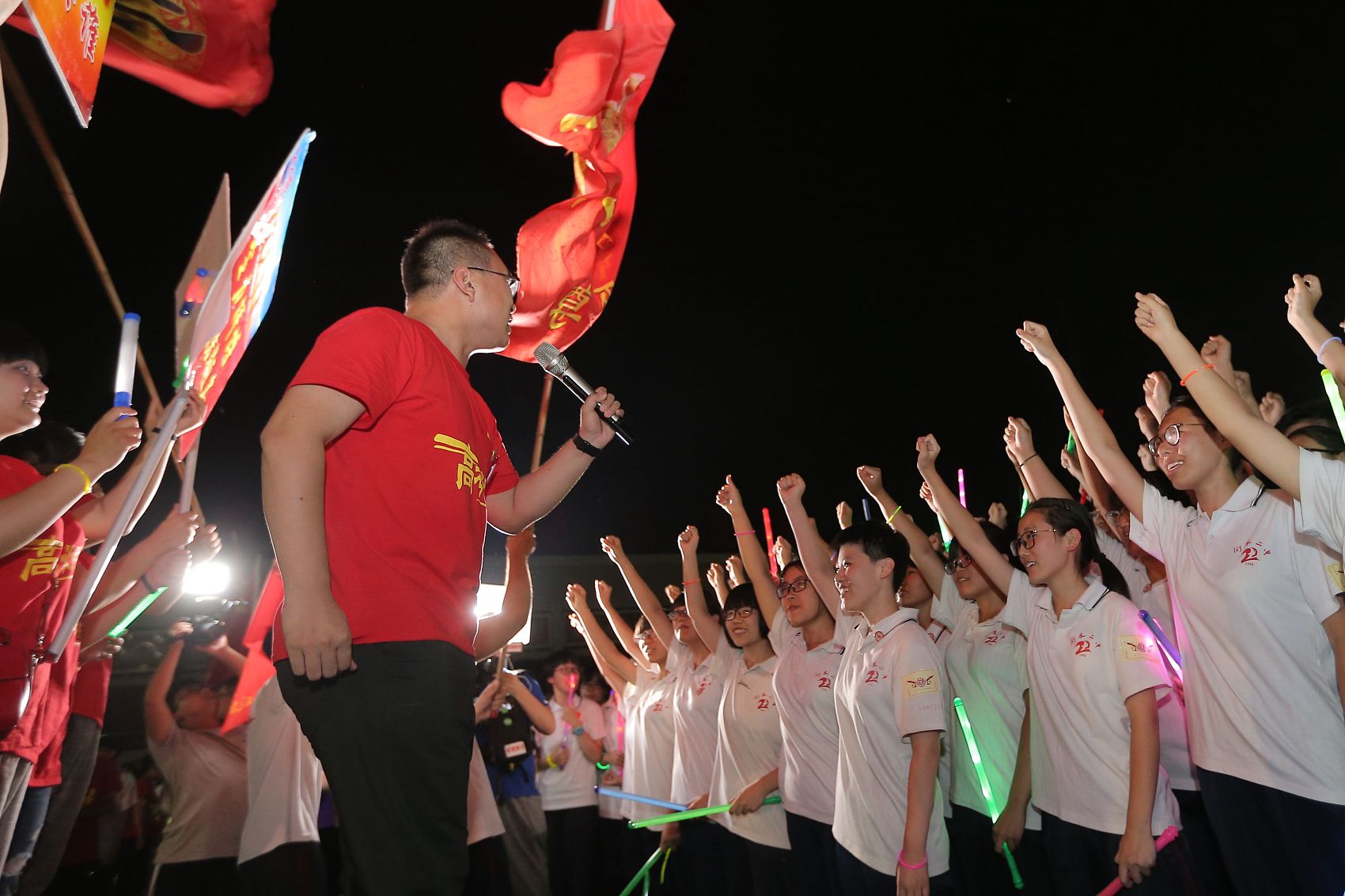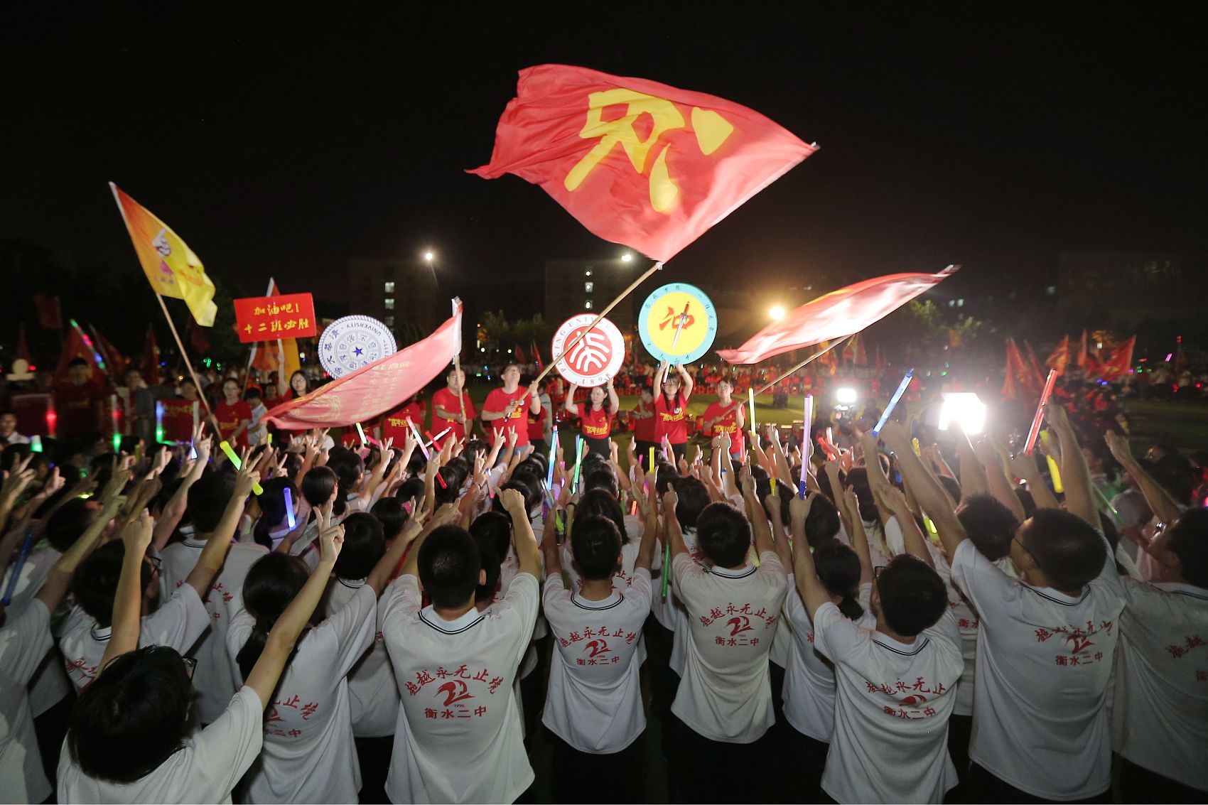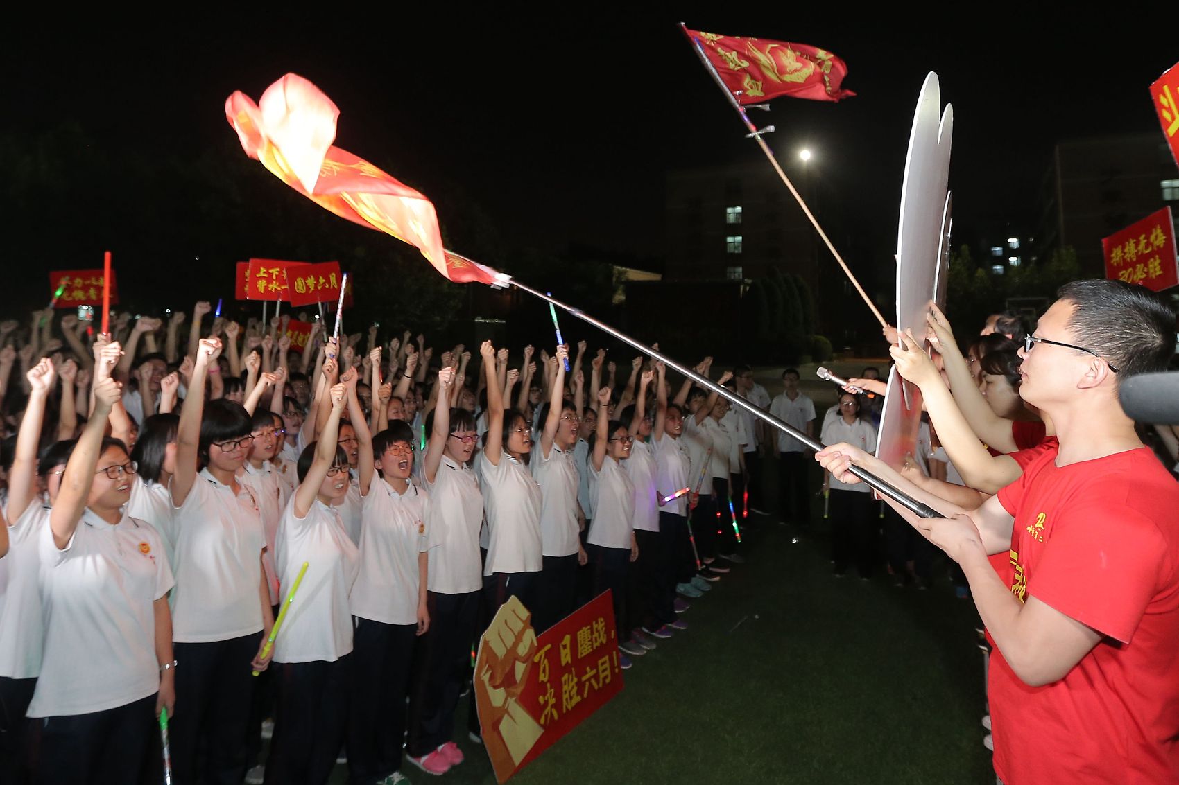 班主任们还高举班旗绕场奔跑,引爆了现场的热烈氛围,学生在班主任及老师的带领下喊出班级冲刺高考的誓言,呐喊铿锵有力,响彻茫茫夜空。
