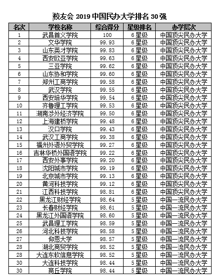 报告显示,在最新校友会2019中国大学排名中,武昌首义学院综合实力最强,问鼎2019中国民办大学排名冠军,文华学院第2,山东英才学院第3,西安欧亚学院第4,三亚学院第5,山东协和学院第6,郑州工商学院第7,武汉学院第8,西安培华学院第9,齐鲁理工学院第10。