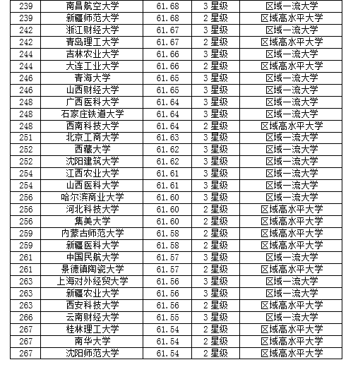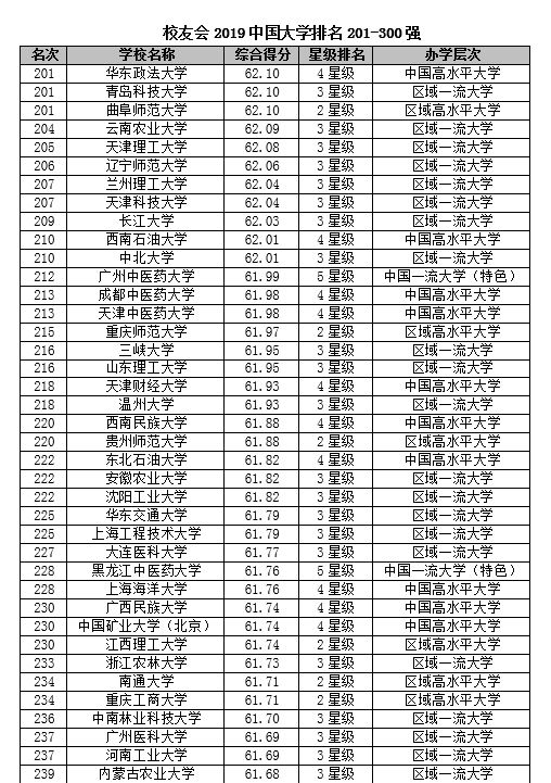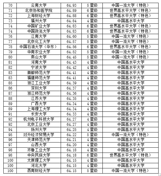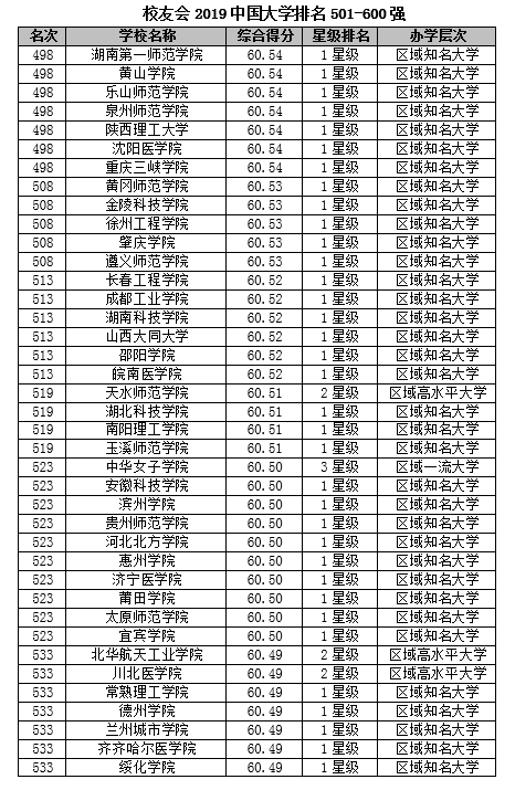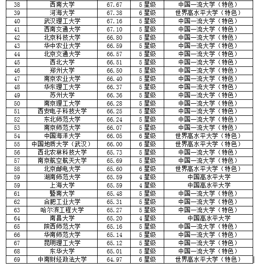 吉林大学、华中科技大学、天津大学、四川大学、南开大学、北京师范大学、中南大学和山东大学等荣膺2019中国七星级大学(7★),跻身世界知名高水平大学、中国顶尖大学行列。东北大学、西北工业大学、华东师范大学、中国社会科学院大学、中国传媒大学、北京体育大学、中央戏剧学院、北京外国语大学和西湖大学等荣膺荣膺2019中国六星级大学(6★),跻身世界高水平大学、中国顶尖大学行列。华中师范大学、西南大学、武汉理工大学、西南交通大学、对外经济贸易大学、西南政法大学、云南民族大学和南方科技大学等荣膺2019中国五星级大学(5★),跻身世界知名大学、中国一流大学行列。