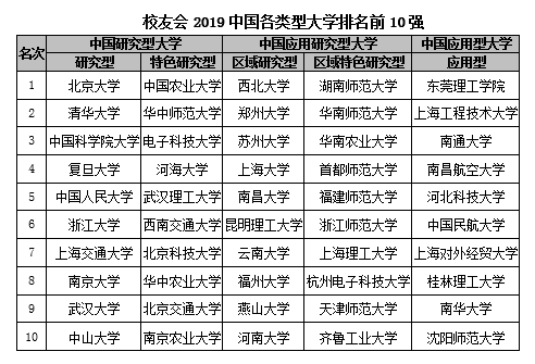 按照最新校友会2019中国大学分类体系标准,将中国高校划分为研究型(中国研究型和特色研究型)、应用研究型(区域研究型和区域特色研究型)、应用型和技术型等4种类型。报告显示,北京大学、清华大学、中国科学院大学、复旦大学、中国人民大学和浙江大学雄居2019中国研究型大学排名前5强。西北大学、郑州大学、苏州大学、湖南师范大学和上海大学名列2019中国应用研究型大学排名前5强。东莞理工学院、上海工程技术大学、南通大学、南昌航空大学和河北科技大学名列2019中国应用型大学排名前5强。