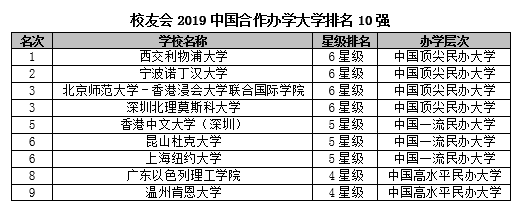 在2019中国合作办学大学排名中,西交利物浦大学第1,宁波诺丁汉大学第2,北京师范大学-香港浸会大学联合国际学院第3,深圳北理莫斯科大学第4,香港中文大学(深圳)第5,昆山杜克大学和上海纽约大学并列第6,广东以色列理工学院第8,温州肯恩大学第9。