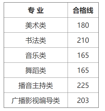 注:美术类专业统考合格分数线总成绩不低于180分,且其中2门科目各不低于60分。