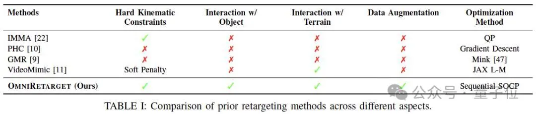 在与其他动作重定向方法的对比中,OmniRetarget在所有关键方面:硬约束、物体交互、地形交互、数据增强表现出了全面的方法优势。