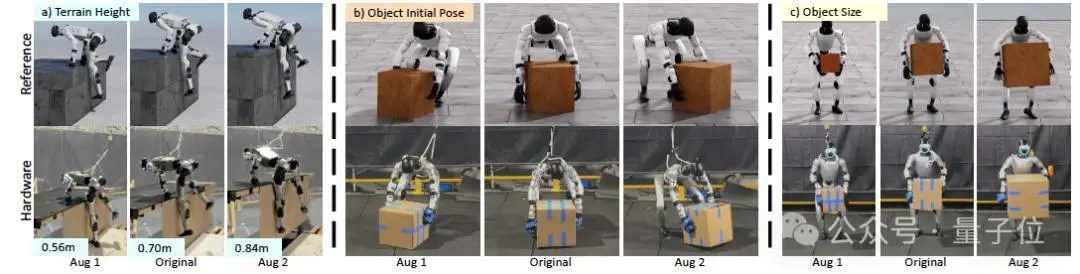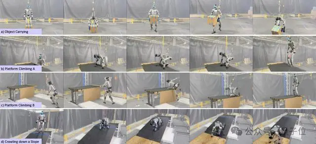 此外,相似动作会分组训练以加快策略收敛,不同的任务(如搬箱和平台攀爬)则采用不同策略设置。