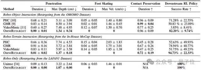 实验结果显示,在运动学质量上,OmniRetarget在穿透、脚部打滑和接触保留指标上整体优于所有基线,即使偶尔轻微穿透也能被 RL 修复。