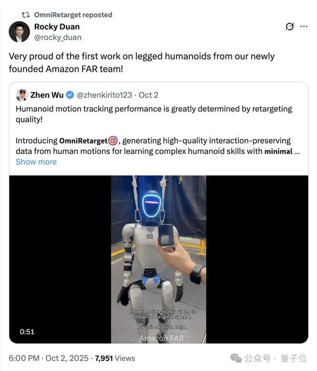 值得一提的是,OmniRetarget背后的Amazon FAR (Frontier AI & Robotics)成立仅七个多月,由华人学者领衔。