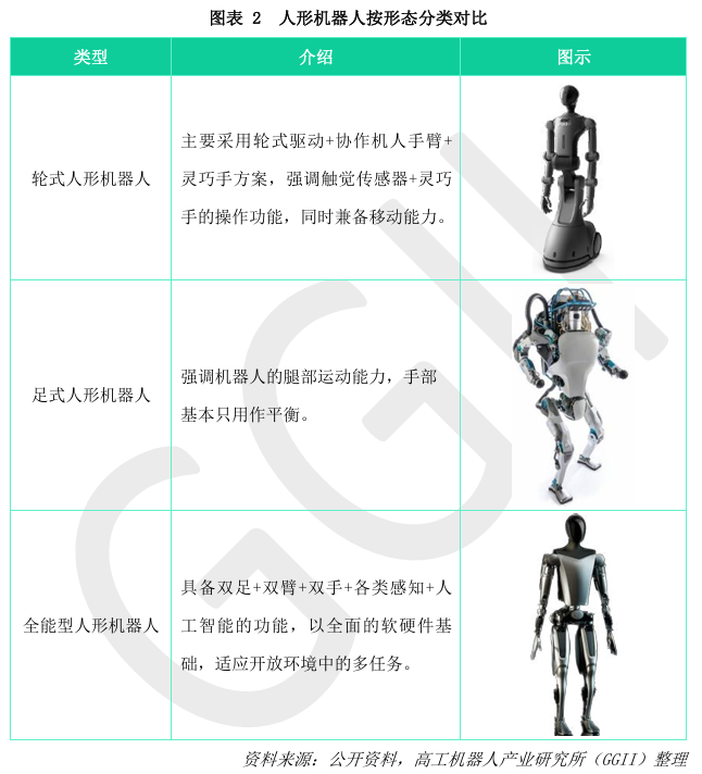 根据人形机器人的形态,可以将其分为轮式人形机器人、足式人形机器人、全能型人形机器人