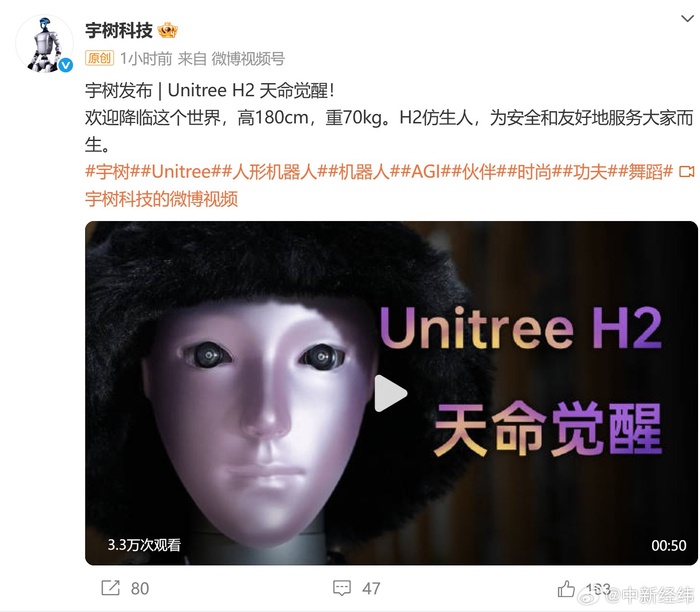2025年10月20日,宇树科技官微正式发布Unitree H2仿生机器人,高180cm,重70kg,“为安全和友好地服务大家而生。”