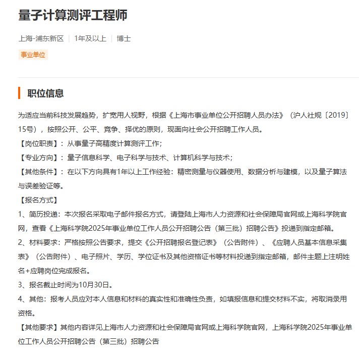 截图来源:上海科学院2025年事业单位工作人员公开招聘公告(第三批)招聘公告
