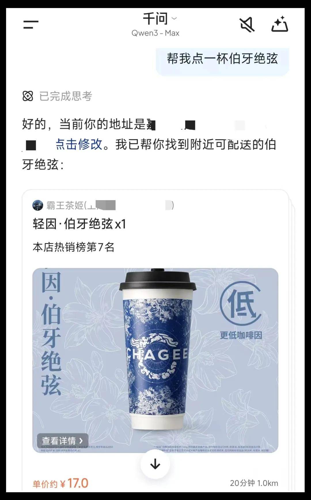 从使用流程来看,用户只需在千问的聊天框里自然说话,如“帮我点杯奶茶”或“帮我点两杯咖啡”,千问即推荐合适商家、生成订单,并通过内置的“支付宝AI付”功能一键付款,全程无需跳转至其他应用。