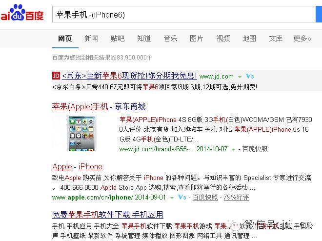 在想要搜索的关键词前使用减号,则是相反的意思,即在搜索结果中不能出现前面带减号的关键词,举个栗子,在百度搜索中输入【苹果手机 -(iPhone6)】,它就表示最后的查询结果中一定不包含【iPhone6】这个关键词。