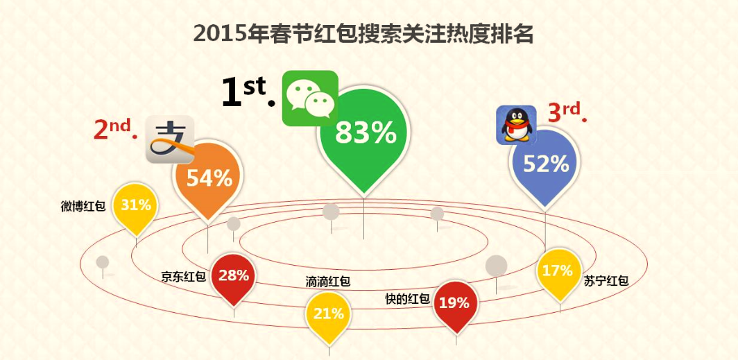 提到2015年春节热点,就不得不提到红包。今年收发红包的形式不再像往年一般仅仅局限于当面赠与,而是通过多种渠道、多类平台共同营造节日喜庆氛围,微信、支付宝、手机QQ、微博等各大平台,借助春节红包热这一突破口大肆进击,红包发放范围及数额均是惊人。