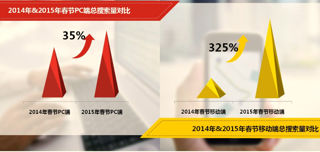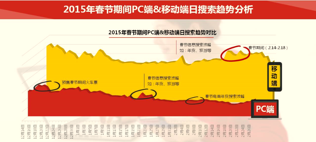 年春节移动端搜索量整体大幅度超出PC端,七成用户的手机搜索行为比平时更多,春节网民在移动端的搜索行为较平时更为突出。