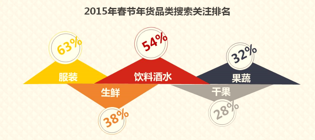 无年货,不春节。中国人习惯于提前购买年货,既为一年一度的家庭大团圆做准备,同时也是接待亲朋好友的必备佳品。2015年,在网友的年货采购名单中,除了传统服饰、饮料/酒水外,生鲜搜索量上升到第三位,便捷的物流加速了食品的流通,新年人们在品尝家乡美食之际,也可以尝到平时少见的新鲜外地食品。