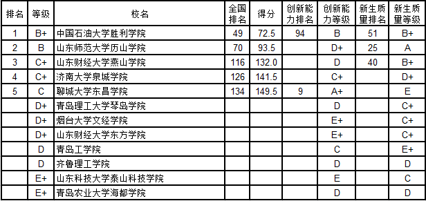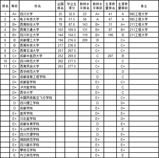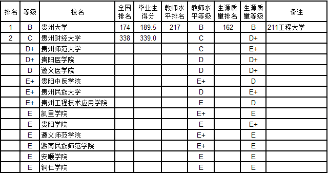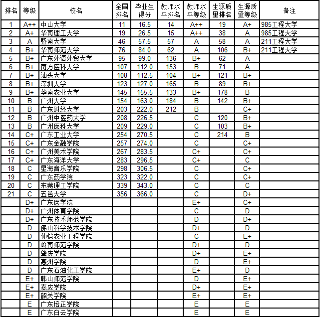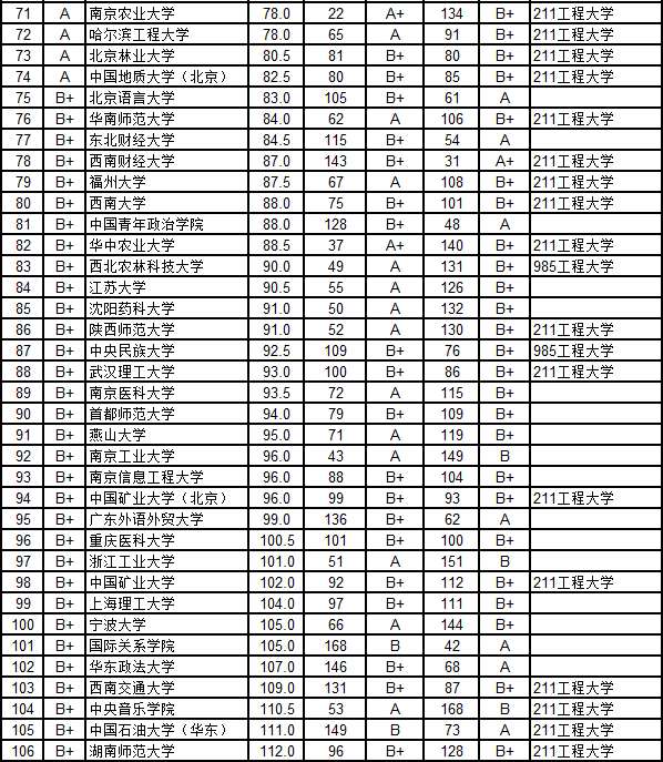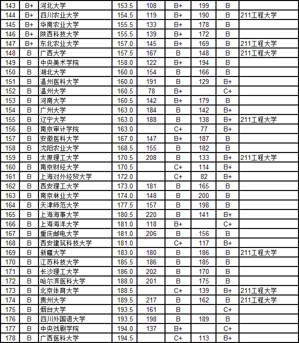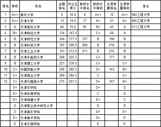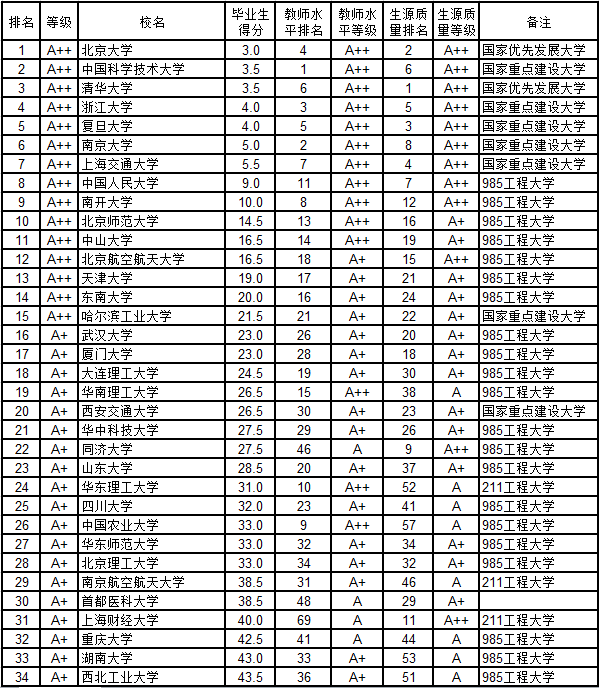 在本排行榜中,毕业生质量C级及以上的,列出排名和等级,C级以下的只列等级,不列排名。教师平均学术水平在B级及以上的,列出排名和等级,B级以下的只列等级,不列排名;新生录取分数线(生源质量)在B级及以上的,列出排名和等级,B级以下的只列等级,不列排名。