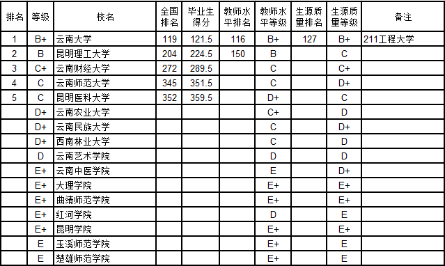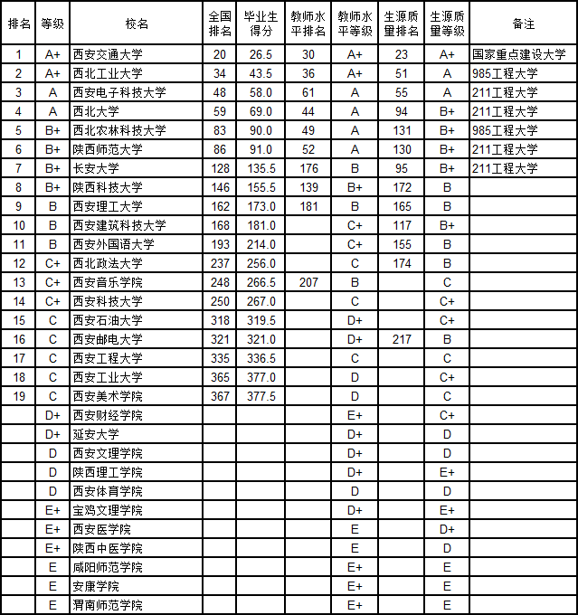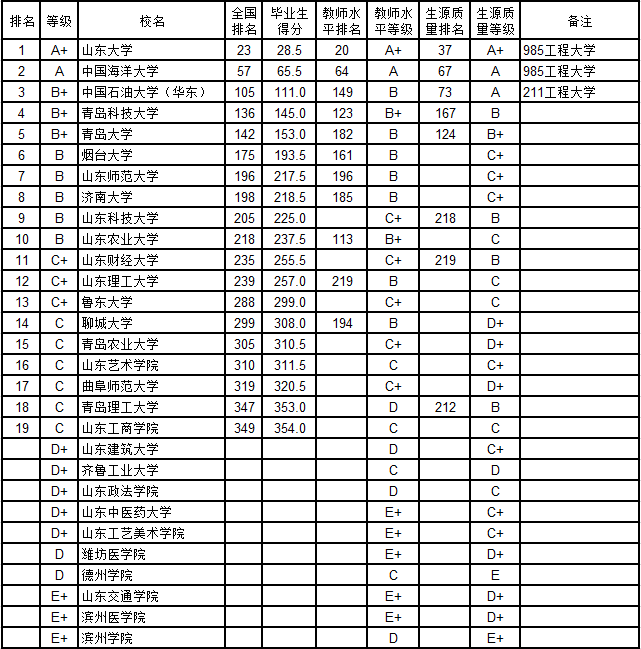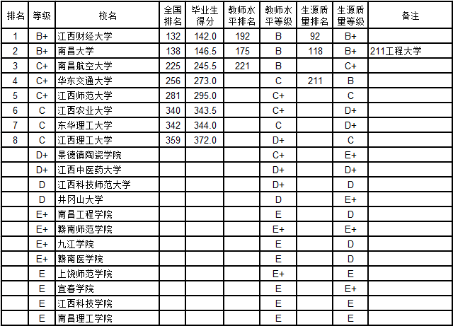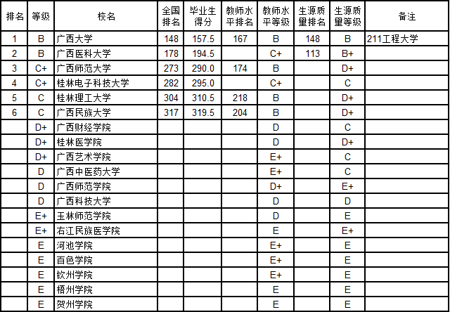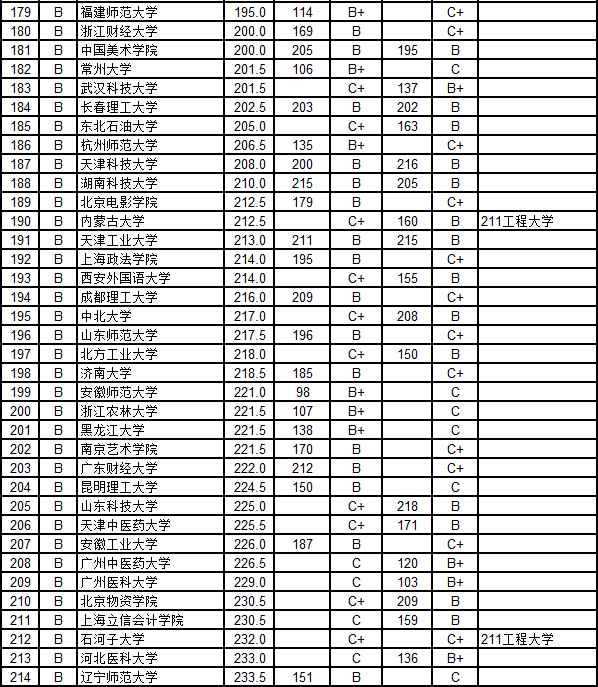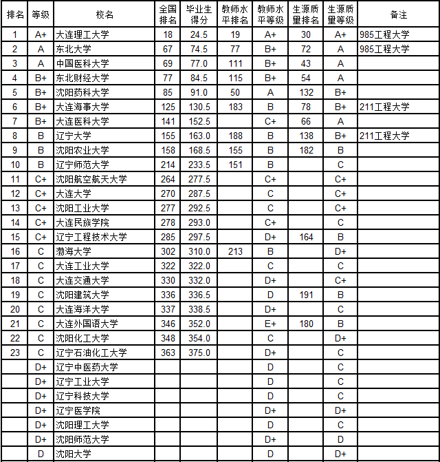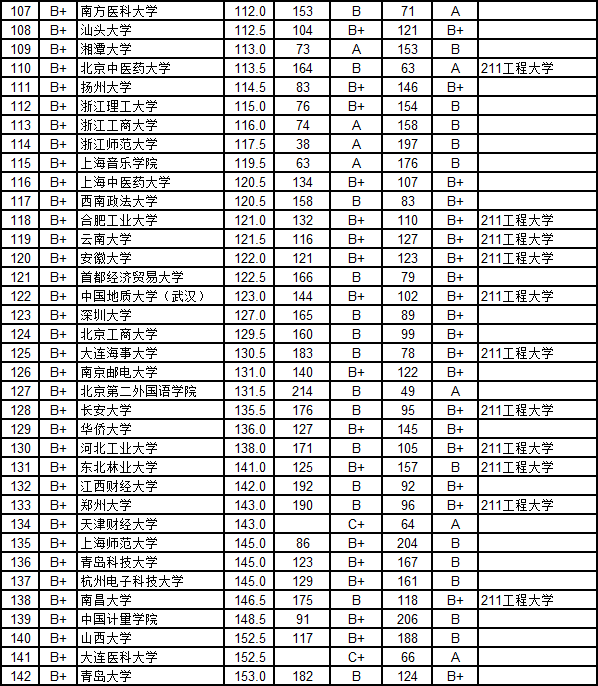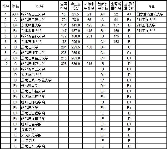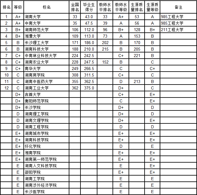 在本排行榜中,本科毕业生质量C级及以上的,列出排名和等级,C级以下的只列等级,不列排名。教师平均学术水平在B级及以上的,列出排名和等级,B级以下的只列等级,不列排名;新生录取分数线(生源质量)在B级及以上的,列出排名和等级,B级以下的只列等级,不列排名。