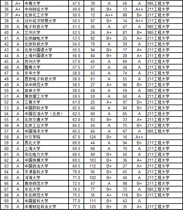 A等:前10%为A等;其中实力最强的前2%是A++级,介于2%~5%(含,以下同)之间的是A+级,5%~10%为A级。