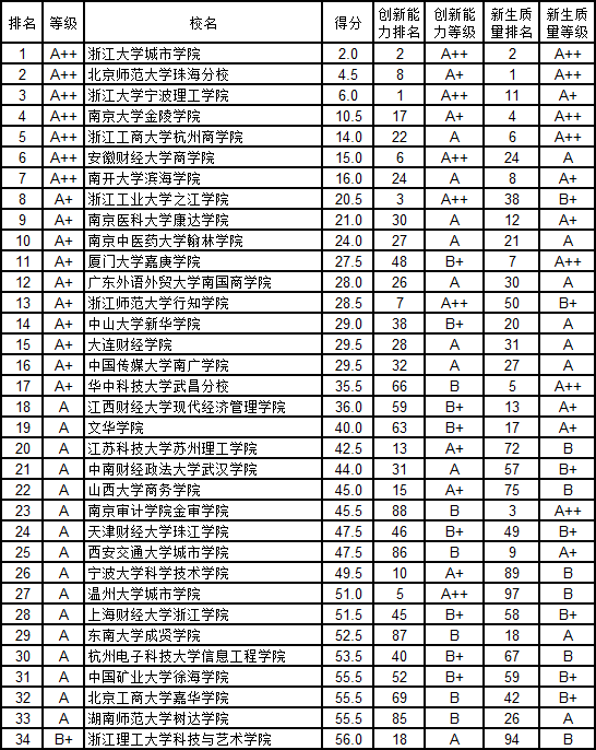 独立学院毕业生质量排名的计算过程:将每所学校的教师创新能力在全国独立学院中的名次,与生源质量在全国独立学院中的名次相加并除以2,得到毕业生得分(越小越好),将所有独立学院的毕业生得分按升序排列,即得到全国独立学院本科毕业生质量排行榜。毕业生得分相同的,创新能力高的学校排在前面。