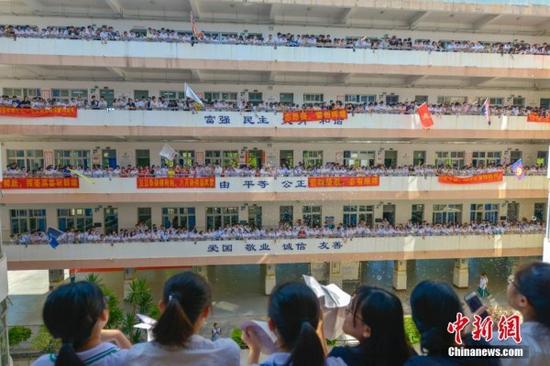 5月31日,海南华侨中学举行一年一度的“高考文明喊楼”活动。该校1200多名高三学生与即将参加高二会考的学生集体“喊楼”释压,同学们齐喊“高考加油!”“老师我爱您!”等口号。整个过程持续半小时,场面壮观。