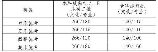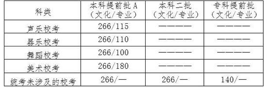⑴按教育部规定,部分独立设置的艺术院校和参照执行的院校(或专业)艺术类本科专业,文化、专业录取控制线由学校自行确定,我省统考涉及到的专业,还需要我省相应类别专业统考合格。其艺术类专科专业:我省统考涉及的,文化、专业录取控制线按我省相应统考类执行; 我省统考未涉及的, 文化控制线为266分,专业控制线由院校确定。