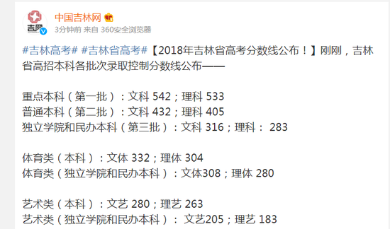 吉林省2018年普通高招生本科各科类、批次录取最低控制分数线 (吉林高考录取分数线)