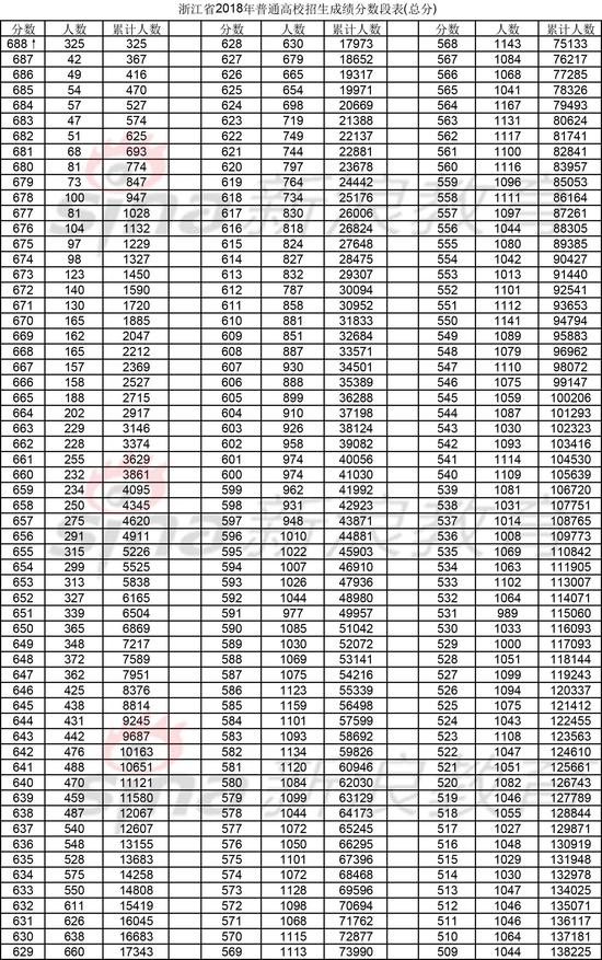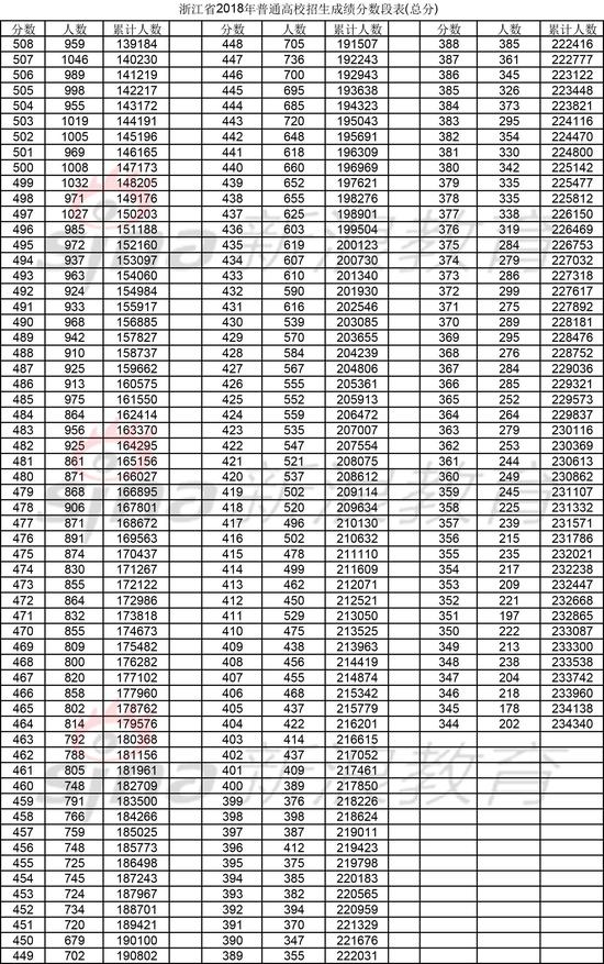 浙江省2018年普通高校招生成绩分数段表公布。