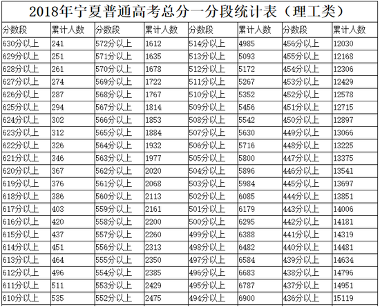 2018年宁夏普通高考总分一分段统计表(理工类)