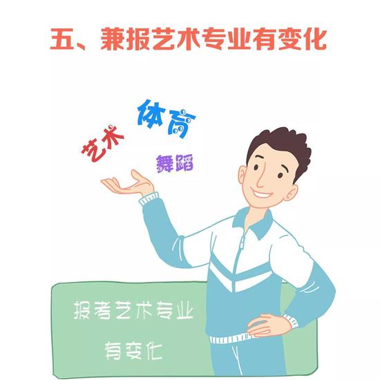 考生兼报艺术类由2018年的8个专业选项精减为6个选项,原来的体育舞蹈和健美操专业不再实行全省统考,调整为招生学校进行校考。广播电视编导专业全省统考只考笔试,不再设面试。