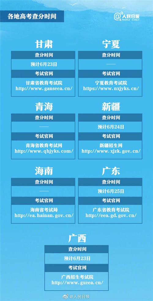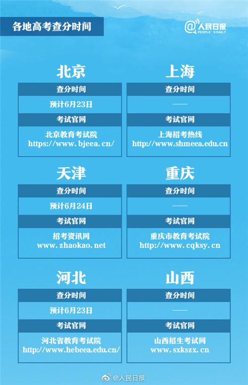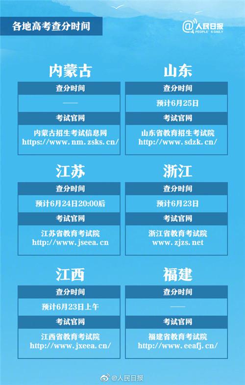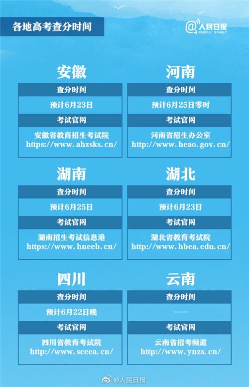 其中,四川计划于6月22日晚公布成绩;北京、湖北、江西、安徽、广西、河北定于6月23日;新疆、吉林定于6月24日;山东定于6月25日前;河南、湖南、广东的考生则可于6月25日起对成绩进行查询。