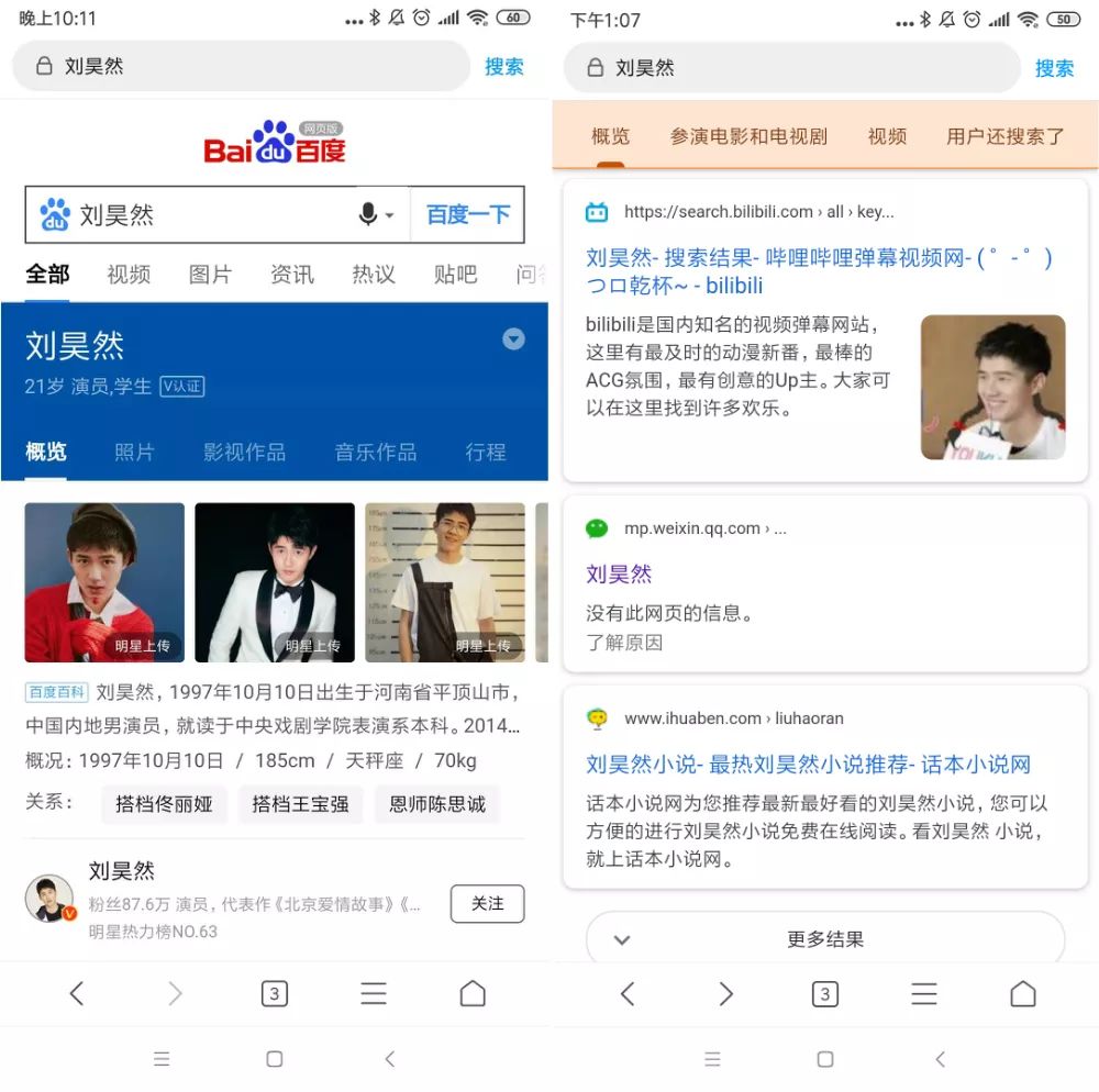 ▲ 百度搜索最上方有资料面板,Google 搜索刘昊然则能显示微信公众号内容