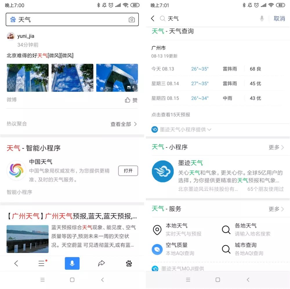 在这部分,内容呈现最突出的当属微信。或许是因为已经试行服务直达、搜索直达很长一段时间,微信在这类服务搜索结果呈现上非常丰富。城市服务、天气服务、天气公众号都会呈现在搜索页面。