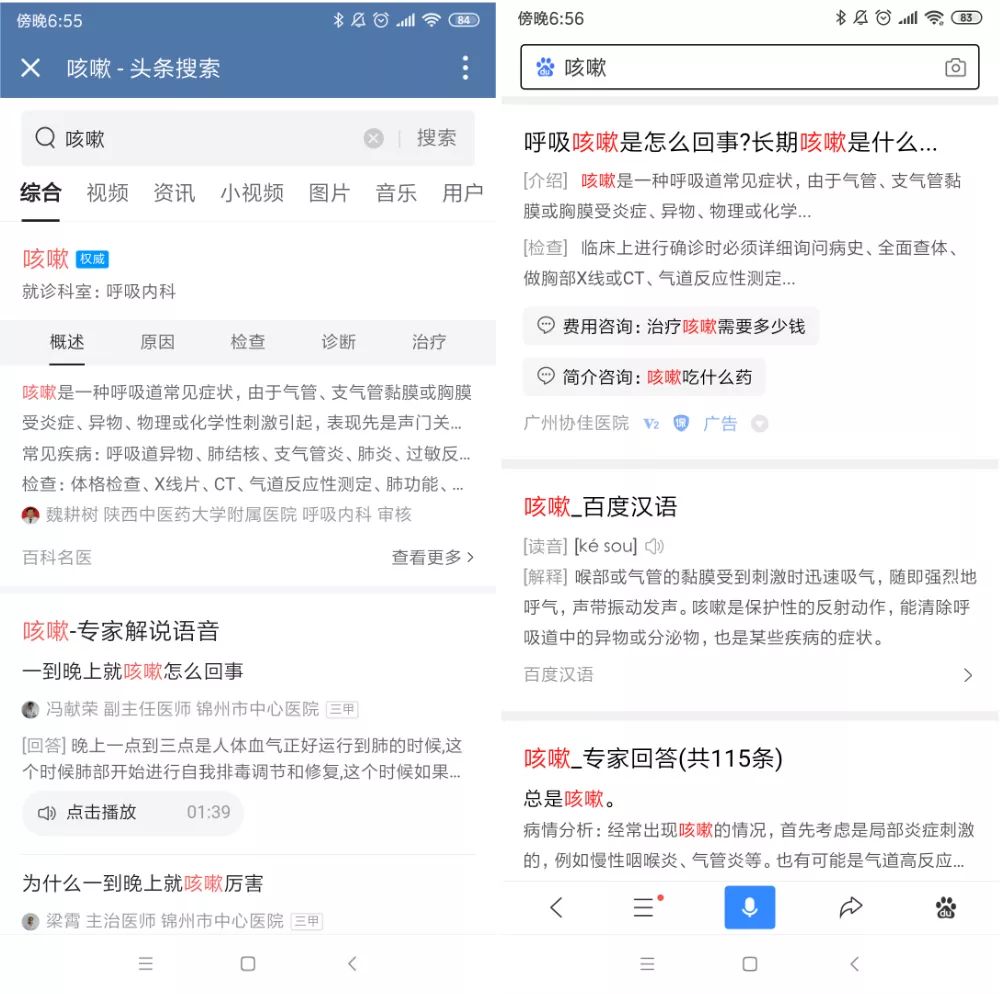 ▲ 左图为头条搜索界面,右图为百度搜索界面