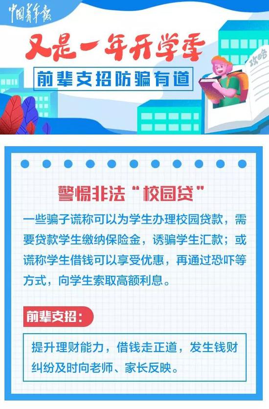 一些骗子谎称可以为学生办理校园贷款,需要贷款学生缴纳保险金,诱骗学生汇款;或谎称学生借钱可以享受优惠,再通过恐吓等方式,向学生索取高额利息。