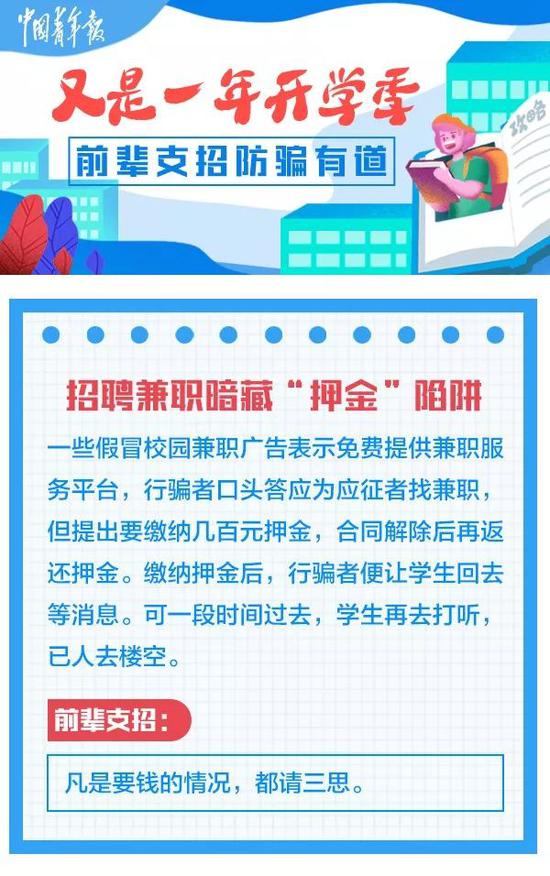 有的校园兼职广告上说,可以免费提供兼职服务平台,但要缴纳几百元押金。缴纳押金后,对方便会让学生回去等消息。学生再去打听,发现已人去楼空。