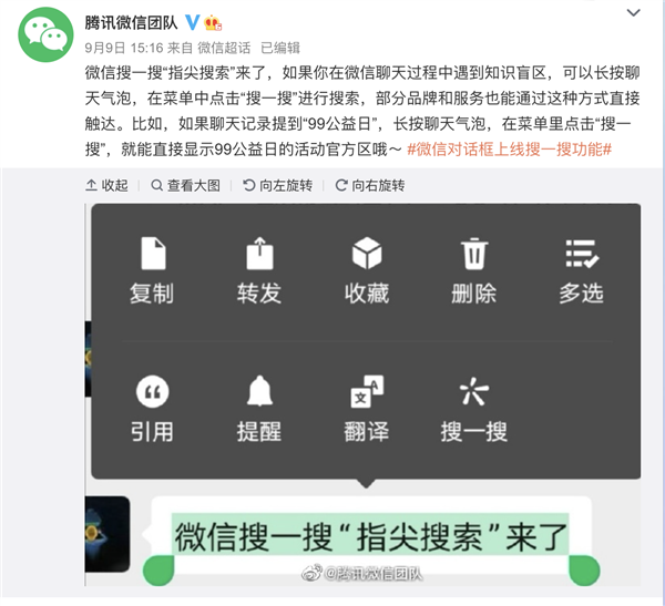 最近微信推出了一个新功能叫「指尖搜索」,其实就是在长按文字消息时,菜单里多了个「搜一搜」的选项,可以不离开对话界面直接进行搜索。