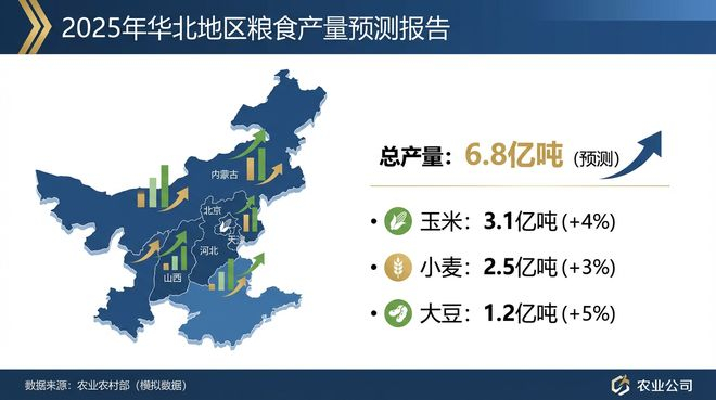 在“体现2025年华北地区粮食产量,PPT风格的汇报图片”的指令下,Nano Banana 2生成的图片中,分别标注出了华北地区各大省份的地理位置、粮食产量模拟数据等信息。用户只需修改数据,就能直接使用。