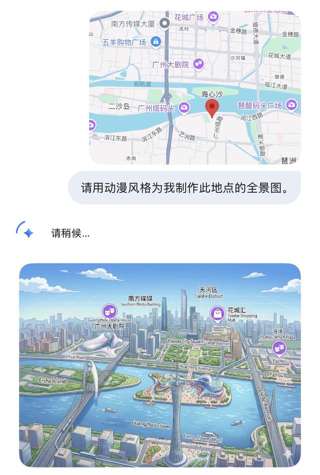第一财经记者用广州塔区域的地图截图,让Nano Banana 2尝试用动漫风格制作此地点的全景图,或许由于网络或后台问题输出速度较慢,但可以看到,画面保持了一定的审美和水准,还原了广州塔、猎德大桥等标志性景点,不过猎德大桥的位置错误,一些中文字体的标注仍有错误。换成网页版输出,虽然速度更快,但连广州塔的位置都绘制错了。由此可见,当前Nano Banana 2的水平还并不稳定,AI也并非完美。